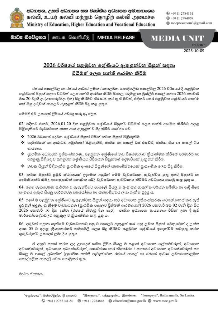 The Ministry of Education has announced that Grade 1 classes for the 2026 academic year will officially commence on Jan. 20, 2026, in all Sinhala, Tamil, and Muslim medium schools across Sri Lanka.