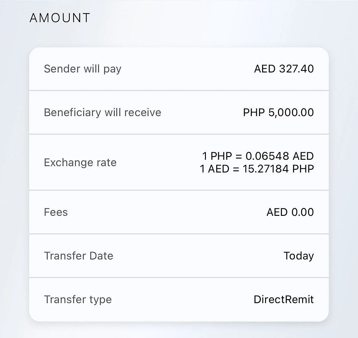 Remittances through this service are currently charged Dh0 in fees, as can be seen below: