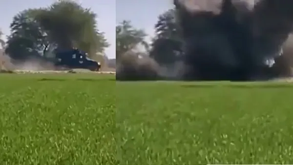 The footage shows a police armoured vehicle on routine patrol when it is struck by a powerful improvised explosive device planted along the roadside. The explosion flips the vehicle and leaves it badly mangled. Moments after the blast, armed militants can be seen firing at police officers who were thrown onto the road by the impact.